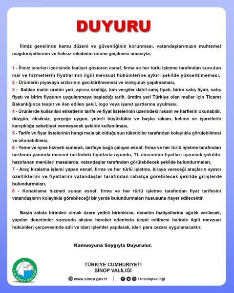 Sinop’ta fırsatçılığa karşı denetimlere ağırlık verilecek