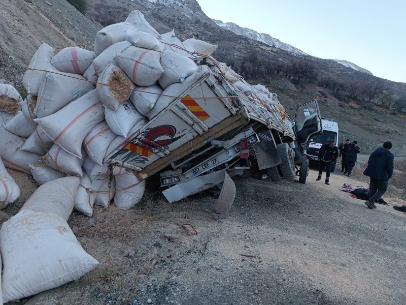Adıyaman’da saman yüklü kamyon devrildi