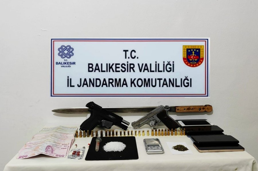 Balıkesir'in Altıeylül ilçesinde jandarma ekipleri 4 şüpheli şahsa yönelik olarak ikamet ve araçlarında yaptıkları operasyonda uyuşturucu madde, 2 ateşli silah, mermi ve suçtan elde edildiği düşünülen 26 bin 600 lira para ele geçirildi. Adli makamlara sevk edilenlerden 2'si tutuklandı.