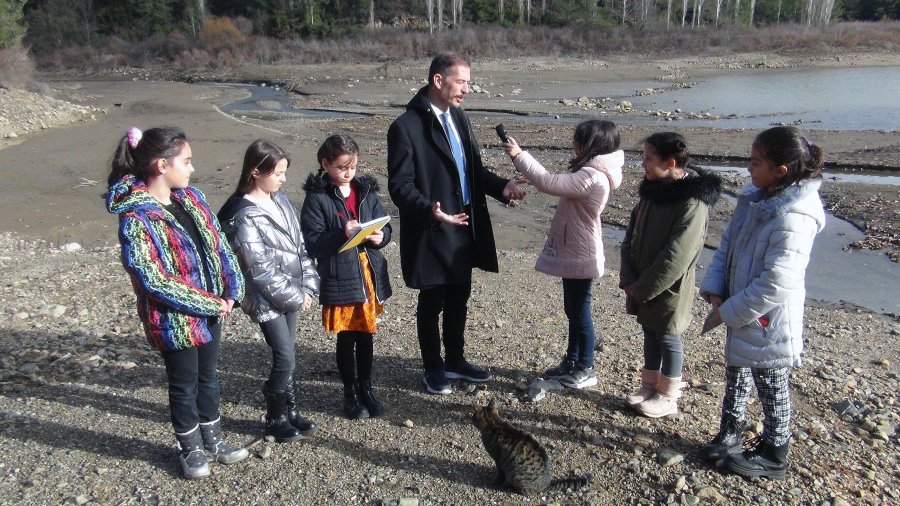 İklim değişikliğinin bariz olarak göründüğü ve su seviyesi yağmur ve kar yağışının azalması ile iyice düşen Ula Göletinde ellerinde kamera ile röportaj yapan öğrenciler, Doç. Dr. Özçelik ile 45 dakikaya varan röportaj gerçekleştirdiler.