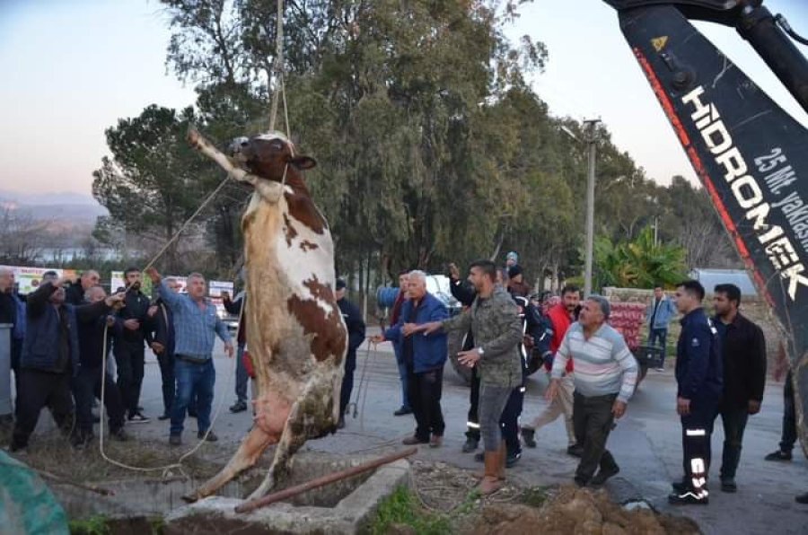 Edinilen bilgiye göre olay, Serik ilçesine bağlı Belpınar Mahallesinde meydana geldi. Sulama kanalı çukuruna düşen ineğin kurtarılması için itfaiye ekiplerine haber verildi. Ekipler tüm müdahalelere rağmen ineği bulunduğu yerden çıkartamadı. Bunun üzerine iş makinası çağrıldı. Kepçeye bağlanan halat yardımıyla inek, sıkıştığı kuyudan çıkartılarak sahibine teslim edildi.