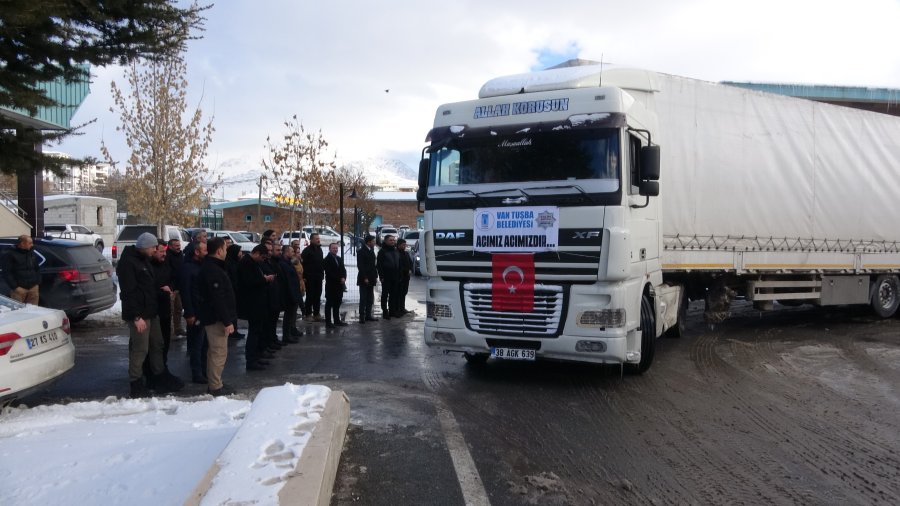Kahramanmaraş merkezli 10 ili vuran depremlerden etkilenen vatandaşlar için Van’da başlatılan yardım kampanyası çerçevesinde temin edilen malzemelerin yüklendiği tırlar yola çıktı.